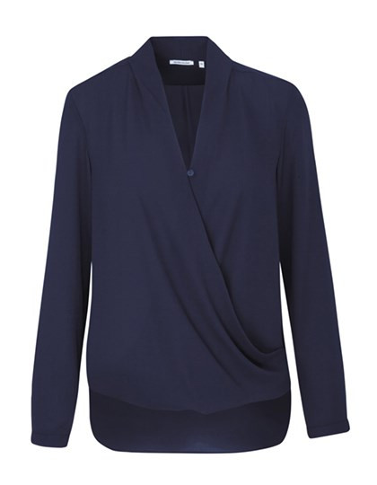 Drapierte Damen-Shirtbluse aus zartem Krepp-Gewebe | Feminine Bluse mit einem modernem Look | Schmale Manschetten | Verlängertes Rückenteil | Fixierende, sichtbare Bündchen vorne | Rückenlänge beträgt 66 cm
