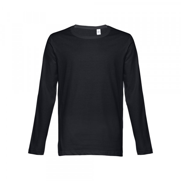 Herren Langarmshirt aus 100% Strickjersey und Baumwolle (150g/m²) mit kardiertem Baumwollfaden, in Tubular-Form, geripptem Kragen in 1x1 Ripp, Jersey-Verstärkung und Doppelnaht an Ärmeln und Saum.Bei den Farben 194, 195 und 199 bestehend aus 60% Baumwolle und 40% Polyester. Größen: S, M, L, XL, XXL