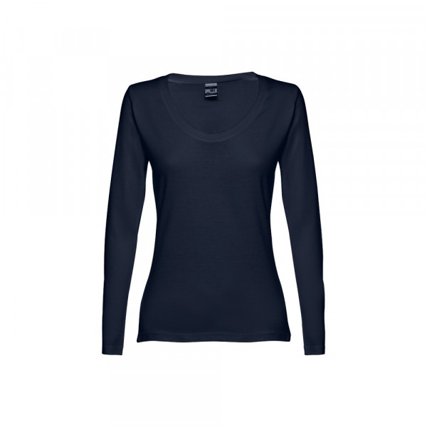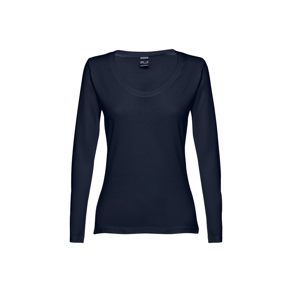 Damen Langarmshirt aus 100% Strickjersey und Baumwolle (150g/m²), tailliert mit kardiertem Baumwollfaden. Bei den Farben 194, 195 und 199 bestehend aus 60% Baumwolle und 40% Polyester, mit Jersey-Kragen, Doppelnaht an Ärmeln und Saum. Größen: S, M, L, XL, XXL