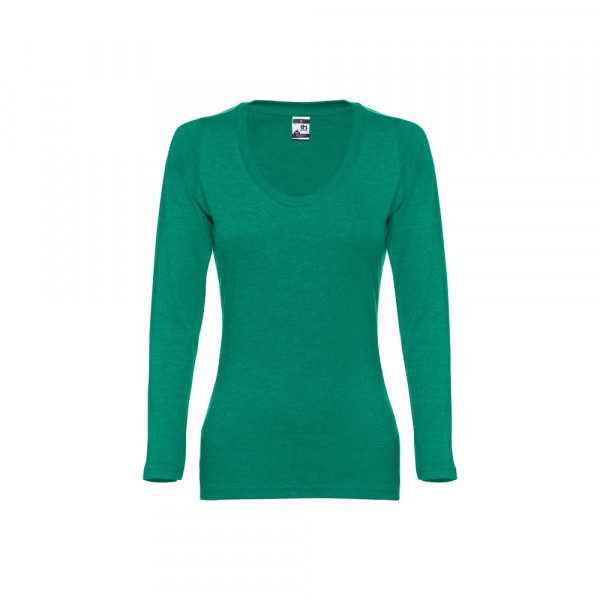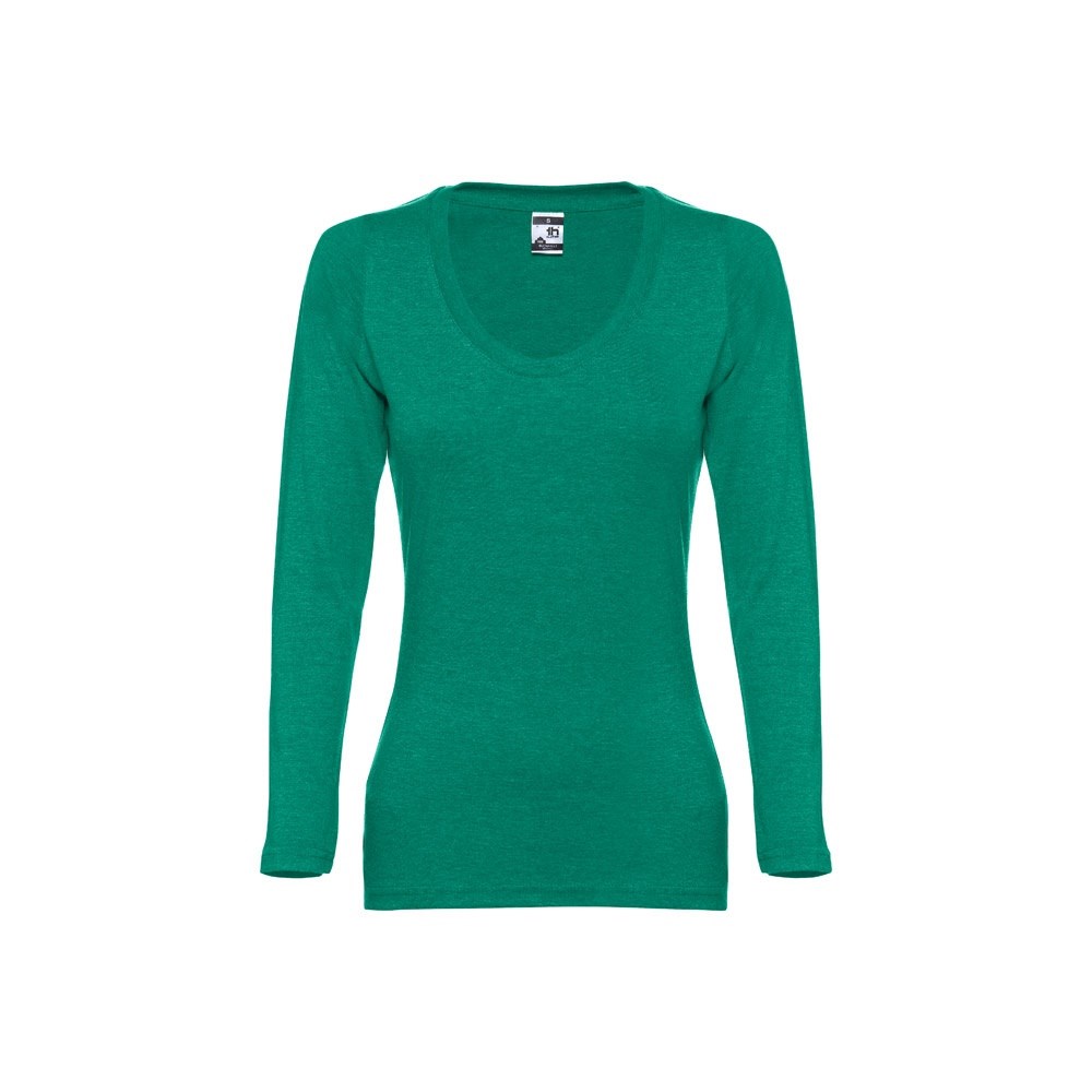 Damen Langarmshirt aus 100% Strickjersey und Baumwolle (150g/m²), tailliert mit kardiertem Baumwollfaden. Bei den Farben 194, 195 und 199 bestehend aus 60% Baumwolle und 40% Polyester, mit Jersey-Kragen, Doppelnaht an Ärmeln und Saum. Größen: S, M, L, XL, XXL