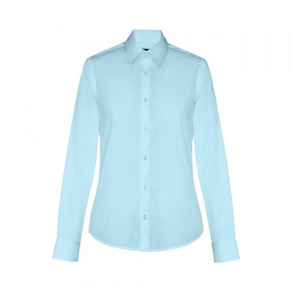 Damen langarm Popeline Bluse aus 68% Baumwolle, 28% Polyamid und 4% Elasthan (115g/m²), tailliert mit verstellbaren Manschetten mit 1 Knopf, 1 Rückenfalte und 1 Knopfleiste mit 7 farblich abgestimmten Knöpfen. Größen: S, M, L, XL, XXL