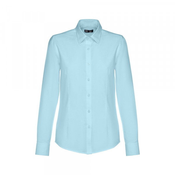 Damen langarm Oxford Bluse aus 70% Baumwolle und 30% Polyester (130g/m²), tailliert mit verstellbaren Manschetten mit 2 Knöpfen, einer Knopfleiste mit 7 farbigen Knöpfen und 2 Vorder- und 2 Rückennähte. Größen: S, M, L, XL, XXL