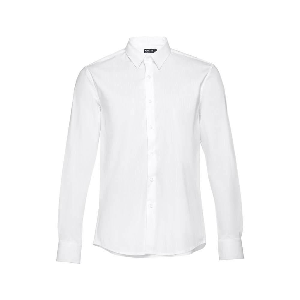 Herren langarm Popeline Hemd aus 68% Baumwolle, 28% Polyamid und 4% Elasthan (115g/m²) mit einer Knopfleiste mit 7 farblich abgestimmten Knöpfen, verstellbaren Manschetten mit 2 Knöpfen und 1 Rückenfalte. Größen: S, M, L, XL, XXL