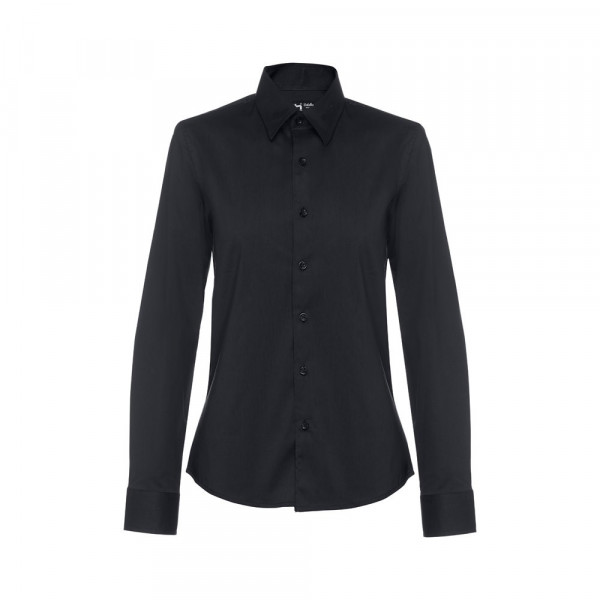 Damen langarm Popeline Bluse aus 35% Baumwolle und 65% Polyester (115g/m²), tailliert mit einem unsichtbaren Knopf für Kragenfestigkeit, einer Knopfleiste mit 7 Knöpfen, verstellbare Manschetten mit 1 Knopf und 2 Rückenfalten. Größen: S, M, L, XL, XXL