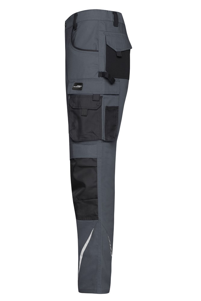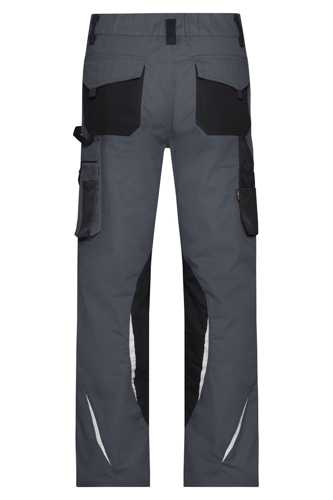 Robustes, strapazierfähiges Mischgewebe Dehnbarer Bund mit Gürtelschlaufen Mit CORDURA® verstärkte Kniepolstertasche Reißfeste Dreifachnaht Schubtaschen, diverse Werkzeugtaschen 2 Taschen mit Reißverschluss Zollstocktasche, Stiftefächer, Handytasche Reflexelemente (ohne Schutzfunktion/keine PSA) an Vorder- und Rückseite 60° waschbar, trocknergeeignet.