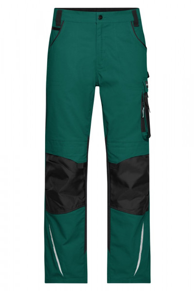 Robustes, strapazierfähiges Mischgewebe Dehnbarer Bund mit Gürtelschlaufen Mit CORDURA® verstärkte Kniepolstertasche Reißfeste Dreifachnaht Schubtaschen, diverse Werkzeugtaschen 2 Taschen mit Reißverschluss Zollstocktasche, Stiftefächer, Handytasche Reflexelemente (ohne Schutzfunktion/keine PSA) an Vorder- und Rückseite 60° waschbar, trocknergeeignet.