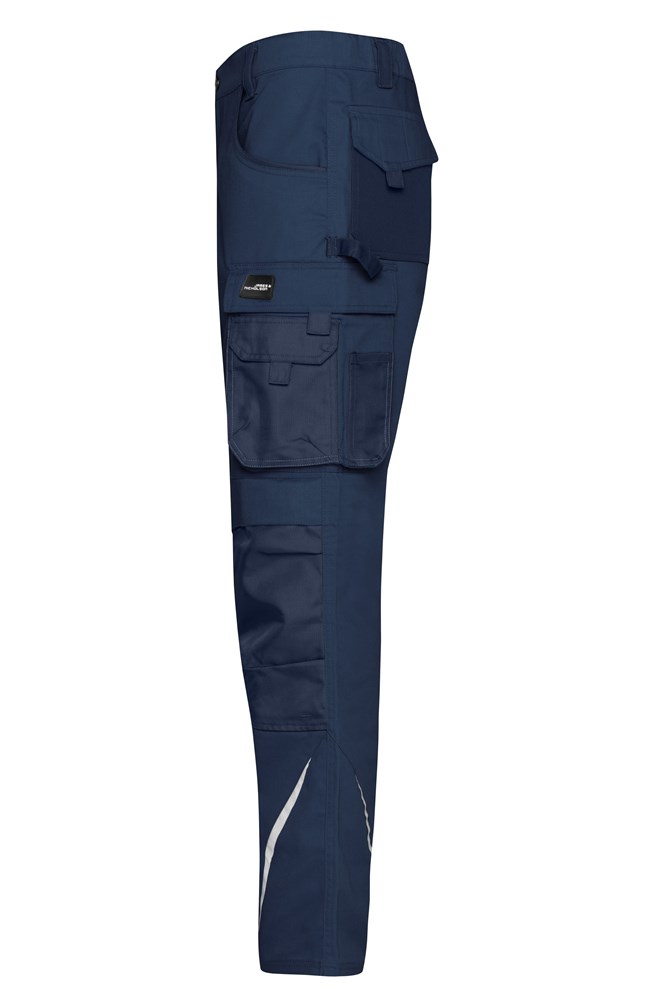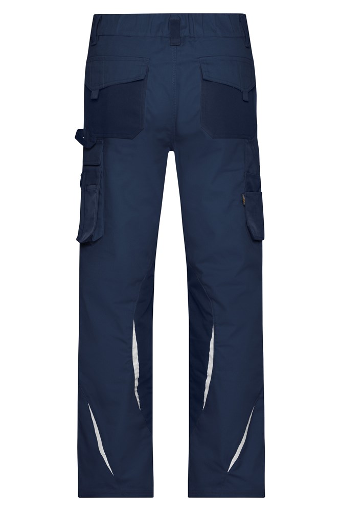 Robustes, strapazierfähiges Mischgewebe Dehnbarer Bund mit Gürtelschlaufen Mit CORDURA® verstärkte Kniepolstertasche Reißfeste Dreifachnaht Schubtaschen, diverse Werkzeugtaschen 2 Taschen mit Reißverschluss Zollstocktasche, Stiftefächer, Handytasche Reflexelemente (ohne Schutzfunktion/keine PSA) an Vorder- und Rückseite 60° waschbar, trocknergeeignet.