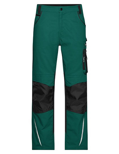 Robustes, strapazierfähiges Mischgewebe | Dehnbarer Bund mit Gürtelschlaufen | Mit CORDURA® verstärkte Kniepolstertasche | Reißfeste Dreifachnaht | Schubtaschen, diverse Werkzeugtaschen | Zwei Taschen mit Reißverschluss | Zollstocktasche, Stiftefächer, Handytasche | Reflektions-Elemente (ohne Schutzfunktion/keine PSA) an Vorder- und Rückseite | Waschbar bis 60 °C | Trocknergeeignet