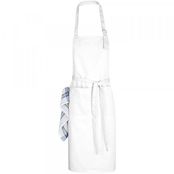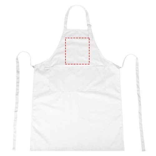 Schürze mit Schnalle an der Nackenschlaufe, um die richtige Größe einzustellen und Bindeband im Rückenbereich. Mit zwei Vordertaschen und Handtuchschlaufe.