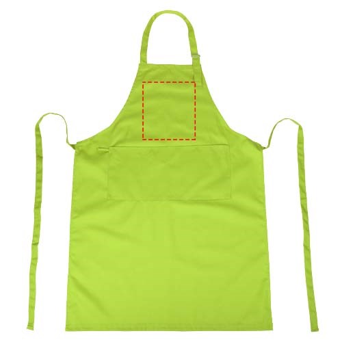 Schürze mit Schnalle an der Nackenschlaufe, um die richtige Größe einzustellen und Bindeband im Rückenbereich. Mit zwei Vordertaschen und Handtuchschlaufe.