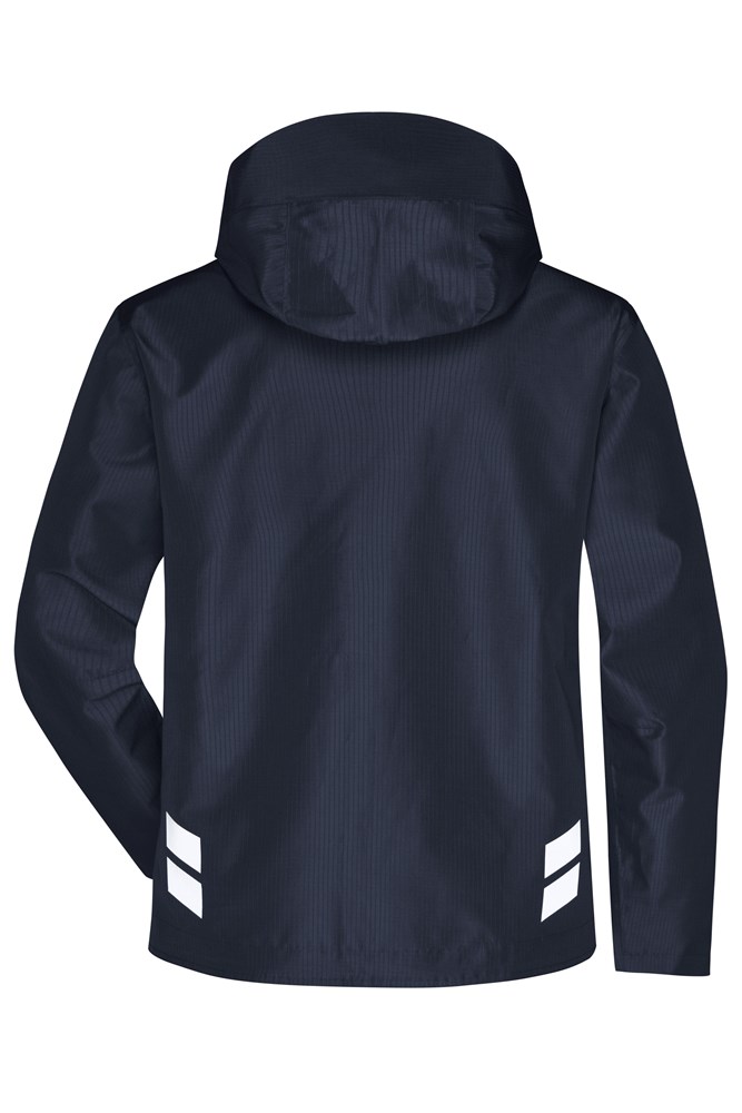 Strapazierfähiges und robustes Rip-Stop-Gewebe aus recyceltem Polyester, wind- und wasserdicht (10.000mm Wassersäule), atmungsaktiv und wasserdampfdurchlässig (5.000g/m²/24h) Versiegelte Nähte Stehkragen Abnehmbare, weiten- und längenregulierbare Kapuze Weitenregulierung am Saum Innenliegende Armbündchen Verlängertes Rückenteil Durchgehend unterlegter, wasserdichter 2-Wege Reißverschluss mit Windschutzblende und Kinnschutz Seitentaschen und Brusttasche mit wasserdichtem Reißverschluss, 1 Innentasche mit Reißverschluss, 1 Innentasche mit Klettverschluss Reflexelemente (ohne Schutzfunktion/keine PSA) an Rückenteil und Ärmel Reißverschluss zur Rückenveredelulng Reißverschlüsse: YKK.