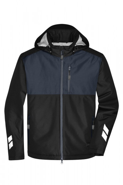 Wärmende DuPont™Sorona® Wattierung Strapazierfähiges und robustes Rip-Stop-Gewebe aus recyceltem Polyester, wind und wasserdicht (10.000mm Wassersäule), atmungsaktiv und wasserdampfdurchlässig (5.000g/m²/24h) Versiegelte Nähte Stehkragen Abnehmbare, weiten- und längenregulierbare Kapuze Weitenregulierung am Saum Innenliegende Armbündchen Verlängertes Rückenteil Durchgehend unterlegter, wasserdichter 2-Wege Reißverschluss mit Windschutzblende und Kinnschutz Seitentaschen und Brusttasche mit wasserdichtem Reißverschluss, 1 Innentasche mit Reißverschluss, 1 Innentasche mit Klettverschluss Reflexelemente (ohne Schutzfunktion/keine PSA) an Rückenteil und Ärmel Reißverschluss zur Rückenveredelulng Reißverschlüsse: YKK.