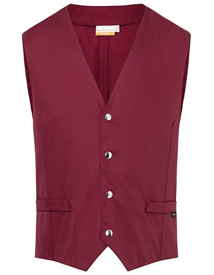Köpergewebe, 215 g/m² | Hochveredelt, gekrumpft, waschecht, pflegeleicht | Herrenweste mit körpernaher Passform, Abnäher | Hinteres Taillenband durch Druckknöpfe verstellbar | 2 seitliche, imitierte Leistentaschen | 4 Druckknöpfe an Verschlussleiste | Industriewäschetauglich | Waschbar bis 95°C