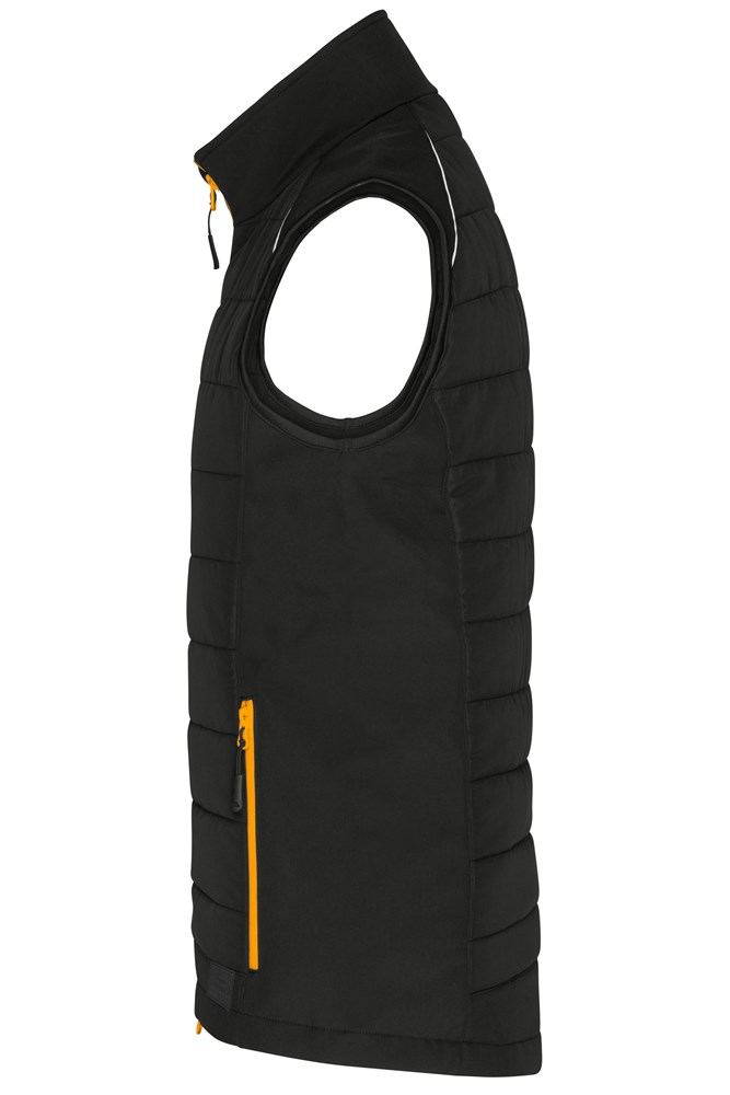 Pflegeleichtes 2-Lagen Softshellmaterial kombiniert mit gesteppen Einsätzen im Vorder- und Rückenteil. Wasser- und schmutzabweisend durch BIONIC-FINISH®ECO Wärmende DuPont™Sorona® Wattierung Stehkragen Durchgehend unterlegter 2-Wege Reißverschluss mit Windschutzblende und Kinnschutz Weitenregulierung am Saum Seitentaschen und Brusttasche mit Reißverschluss, 1 Innentasche mit Klettverschluss Reflexelemente (keine Schutzfunktion, keine PSA) an Vorder- und Rückenteil Reißverschluss zur Rückenveredelung Reißverschlüsse: YKK JN1821: leicht tailliert.