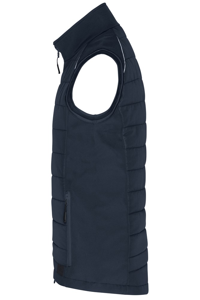 Pflegeleichtes 2-Lagen Softshellmaterial kombiniert mit gesteppen Einsätzen im Vorder- und Rückenteil. Wasser- und schmutzabweisend durch BIONIC-FINISH®ECO Wärmende DuPont™Sorona® Wattierung Stehkragen Durchgehend unterlegter 2-Wege Reißverschluss mit Windschutzblende und Kinnschutz Weitenregulierung am Saum Seitentaschen und Brusttasche mit Reißverschluss, 1 Innentasche mit Klettverschluss Reflexelemente (keine Schutzfunktion, keine PSA) an Vorder- und Rückenteil Reißverschluss zur Rückenveredelung Reißverschlüsse: YKK JN1821: leicht tailliert.
