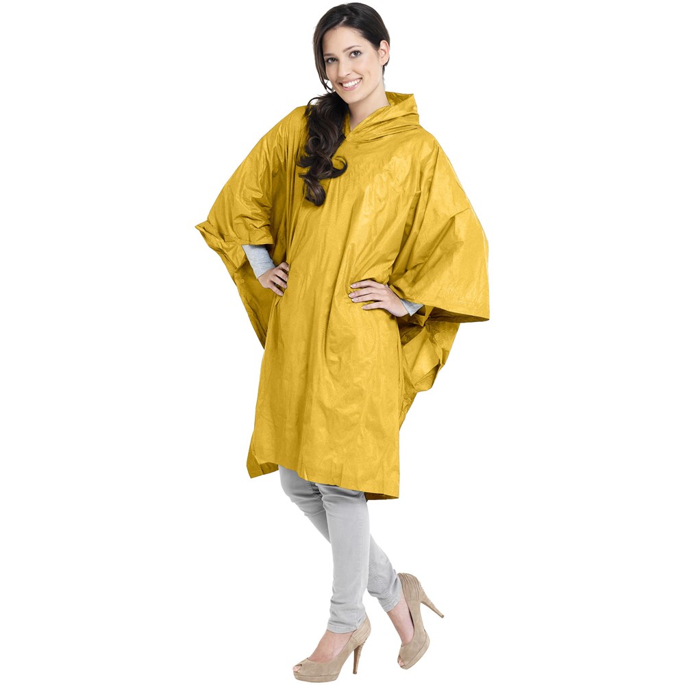 Ein faltbarer Poncho mit Kapuze für unerwartete Regenschauer bei jeder Outdoor-Aktivität. Der wiederverwendbare Poncho ist 100x130 cm groß und hat auf jeder Seite einen Knopfverschluss. Erhältlich in vielen verschiedenen Farben mit einer großen Dekorationsfläche auf dem Beutel.