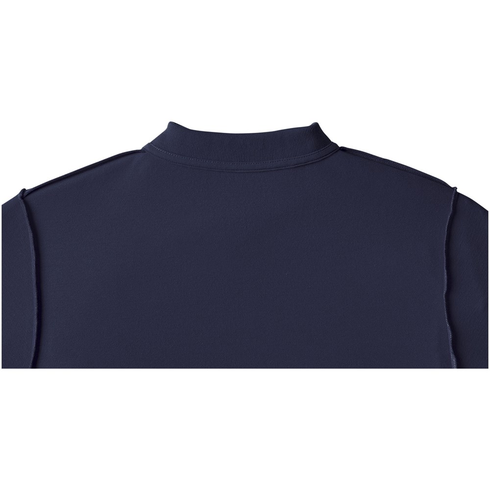 Individuelles Produkt-Branding für den Innenbereich. Ablösbares Label für Tragekomfort. Flachstrickkragen. 2-er Knopfleiste mit gravierten Knöpfen. Doppelnaht an Kragen und Saum. Knopf Ton-in-Ton. Nackenband in Kontrastfarbe.