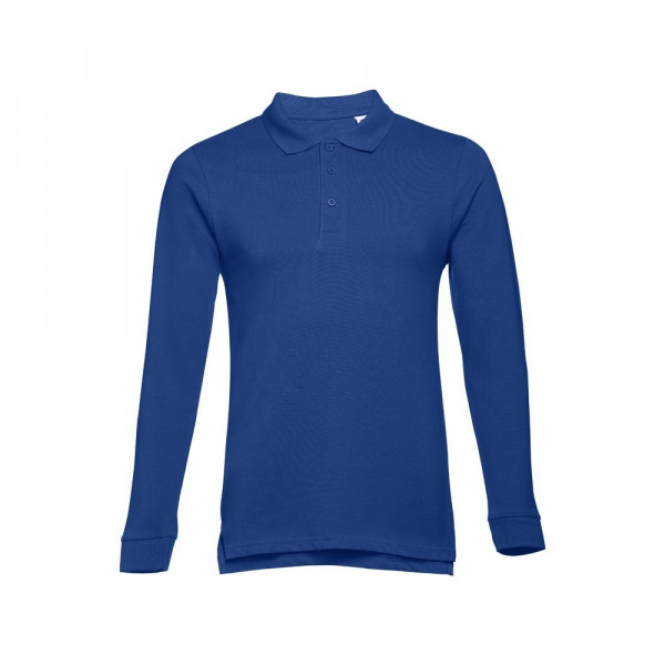 Herren langarm Poloshirt aus Piqué Stoff 100% kardierter Baumwolle (210g/m²) mit geripptem Kragen und Ärmelbund, einem Verstärkungsband am Kragen, einer verstärkten Knopfleiste mit 3 farblich abgestimmten Knöpfen und einem Ersatzknopf an der Innennaht. Unten mit seitlichen Öffnungen. Bei der Farbe 183 bestehend aus 85% Baumwolle und 15% Viskose. Etikett ist abreissbar. Größen: S, M, L, XL, XXL