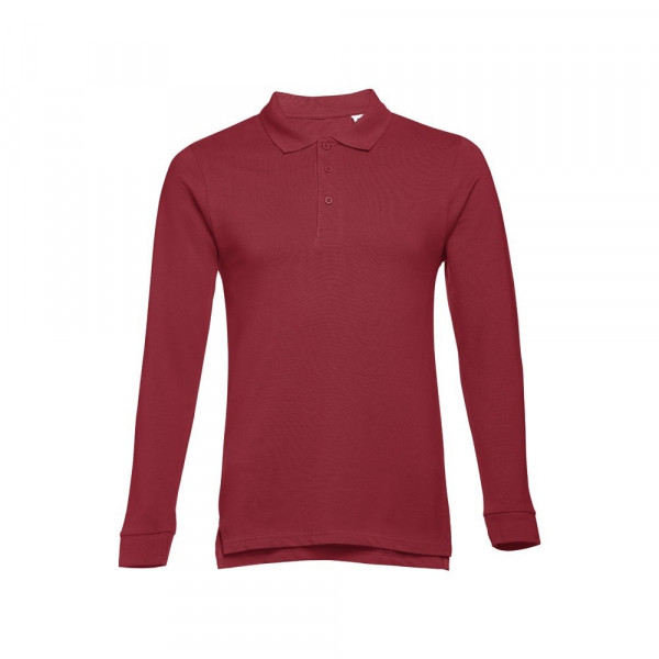 Herren langarm Poloshirt aus Piqué Stoff 100% kardierter Baumwolle (210g/m²) mit geripptem Kragen und Ärmelbund, einem Verstärkungsband am Kragen, einer verstärkten Knopfleiste mit 3 farblich abgestimmten Knöpfen und einem Ersatzknopf an der Innennaht. Unten mit seitlichen Öffnungen. Bei der Farbe 183 bestehend aus 85% Baumwolle und 15% Viskose. Etikett ist abreissbar. Größen: S, M, L, XL, XXL