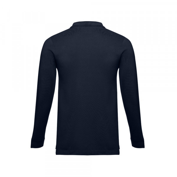Herren langarm Poloshirt aus Piqué Stoff 100% kardierter Baumwolle (210g/m²) mit geripptem Kragen und Ärmelbund, einem Verstärkungsband am Kragen, einer verstärkten Knopfleiste mit 3 farblich abgestimmten Knöpfen und einem Ersatzknopf an der Innennaht. Unten mit seitlichen Öffnungen. Bei der Farbe 183 bestehend aus 85% Baumwolle und 15% Viskose. Etikett ist abreissbar. Größen: S, M, L, XL, XXL