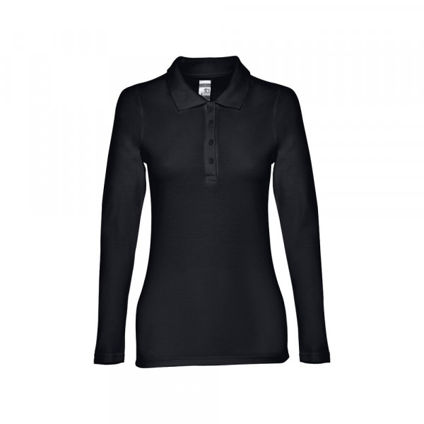 Damen langarm Poloshirt aus Piqué Stoff 100% kardierter Baumwolle (210g/m²) mit geripptem Kragen und Ärmelbund, Verstärkungsband am Kragen und verstärkte Knopfleiste mit 4 farblich abgestimmten Knöpfen und mit einem Ersatzknopf an der Innennaht. Unten mit seitlichen Öffnungen. Bei der Farbe 183 bestehend aus 85% Baumwolle und 15% Viskose. Etikett ist abreissbar. Größen: S, M, L, XL, XXL