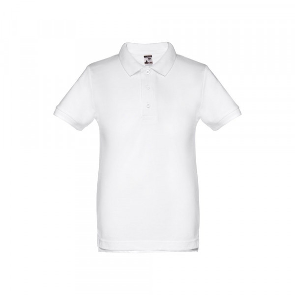 Kinder Poloshirt aus Piqué Stoff 100% Baumwolle (195g/m²), unisex, mit geripptem Kragen und Ärmel, Verstärkungsband am Kragen und verstärkte Knopfleiste mit 3 farblich abgestimmten Knöpfen. Unten mit seitlichen Öffnungen. Ersatzknopf an der Innennaht. Größen: 2, 4, 6, 8, 10, 12