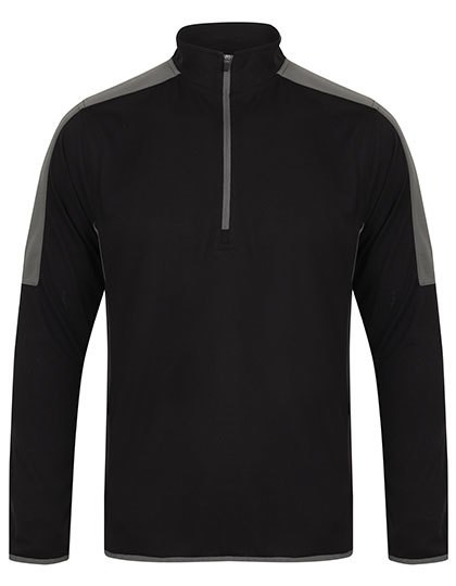 Hauptteil: 100 % Polyester Single Jersey (165 g/m²), Einsätze: 100 % Polyester Interlock (250 g/m²) | Kurzer Reißverschluss am Ausschnitt mit Stehkragen | Einsätze in Kontrastfarbe an den Seiten und Ärmeln | Umgekehrter Nylon-Reißverschluss mit verriegelbarem Schieber | Kontrastfarbene Stretch-Einfassung an Ärmelbündchen und Saum | Verdeckte Tasche in Teilungsnaht auf der rechten Seite (wie getragen) | Neues, heraustrennbares „Finden & Hales“-Etikett für einfaches Umlabeln