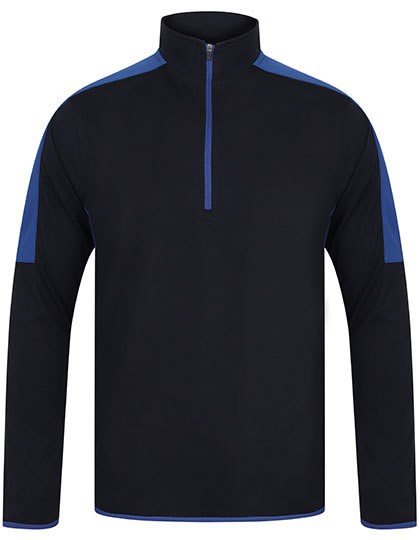 Hauptteil: 100 % Polyester Single Jersey (165 g/m²), Einsätze: 100 % Polyester Interlock (250 g/m²) | Kurzer Reißverschluss am Ausschnitt mit Stehkragen | Einsätze in Kontrastfarbe an den Seiten und Ärmeln | Umgekehrter Nylon-Reißverschluss mit verriegelbarem Schieber | Kontrastfarbene Stretch-Einfassung an Ärmelbündchen und Saum | Verdeckte Tasche in Teilungsnaht auf der rechten Seite (wie getragen) | Neues, heraustrennbares „Finden & Hales“-Etikett für einfaches Umlabeln