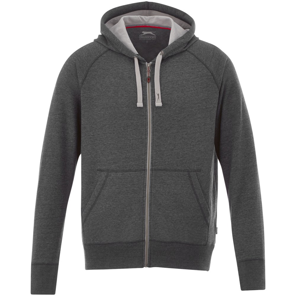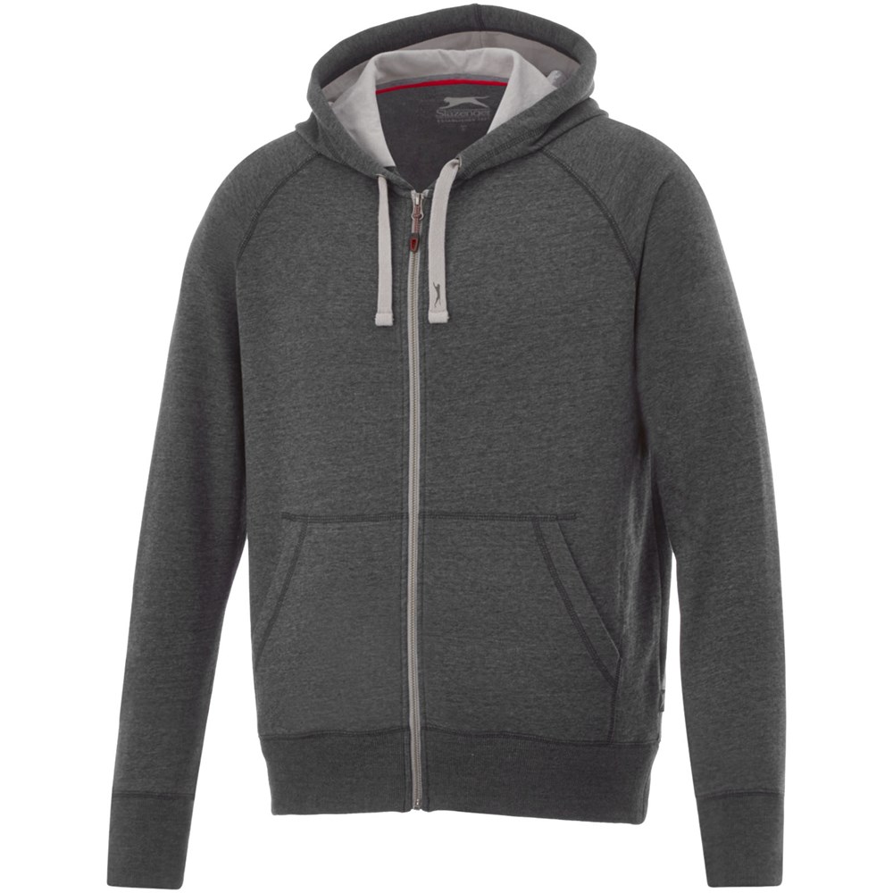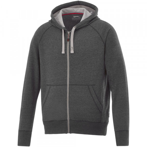 Kontrastfarbiges Single-Jersey Futter. Mediatasche in der rechten Innentasche. Daumenlöcher. Herren und Damen Modell mit Kordelzug in Kapuze. Kängurutasche. Kontrastfarbige Flatlock-Naht. Elasischer 2x2 Rippstrickbund. 1x1 Rippstrickkragen und Bund. Metall-Reißverschluss. 2-farbiges Nackenband.