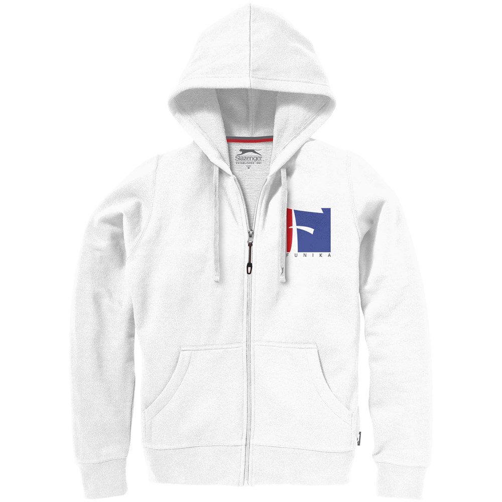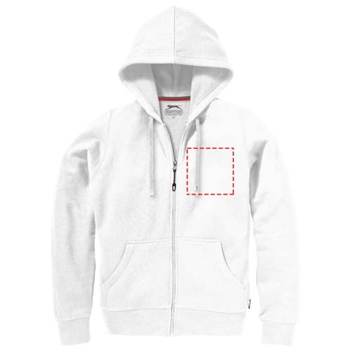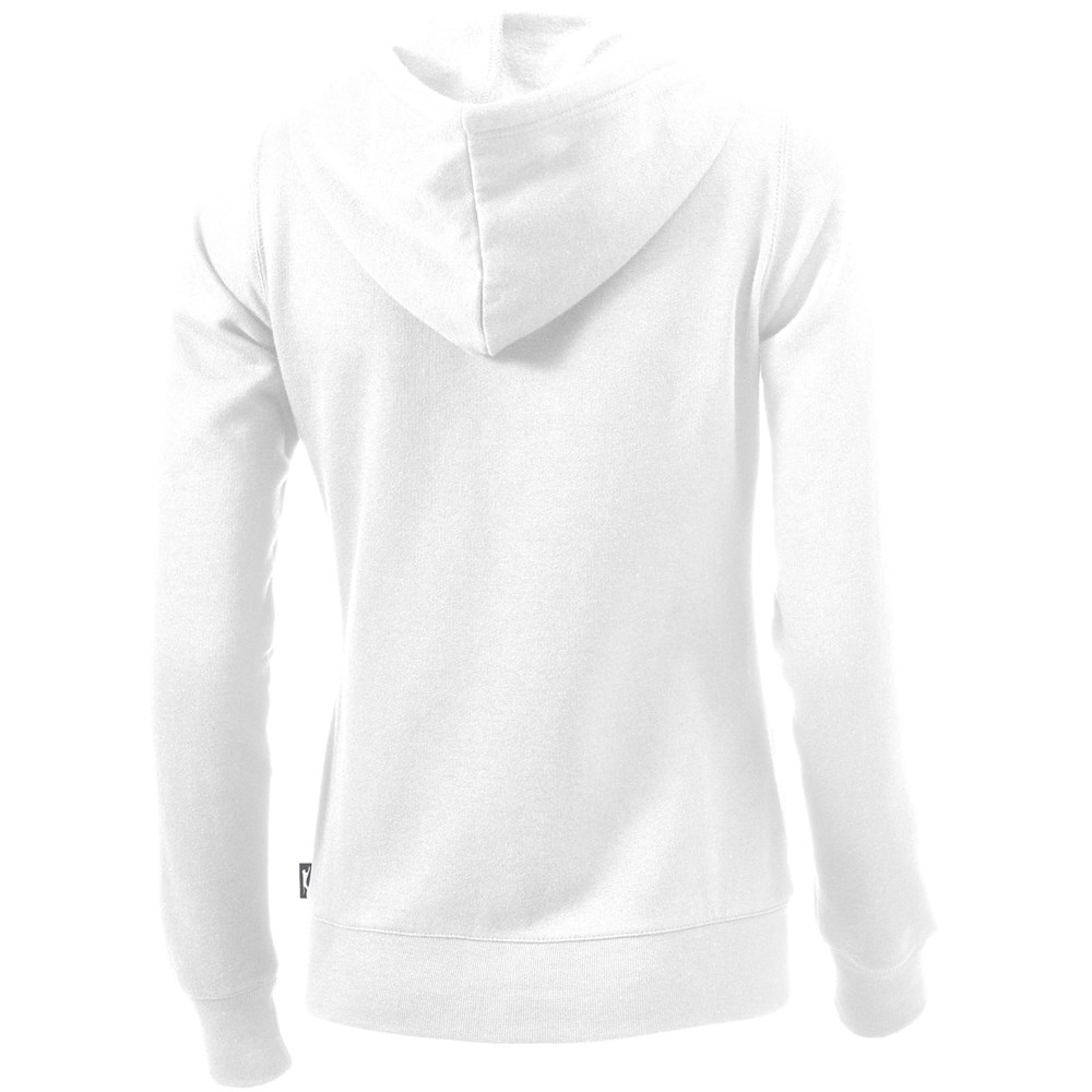 1x1 Rippstrickkragen und Bund. Elasischer 2x2 Rippstrickbund. Kängurutasche. Herren und Damen Modell mit Kordelzug in Kapuze. Tailliert für eine schmeichelhafte Passform. Easy Grip Reißverschluss Puller. Halbmond. 2-farbiges Nackenband. Antike silberne Ösen mit graviertem Logo. Label an Seitennaht.