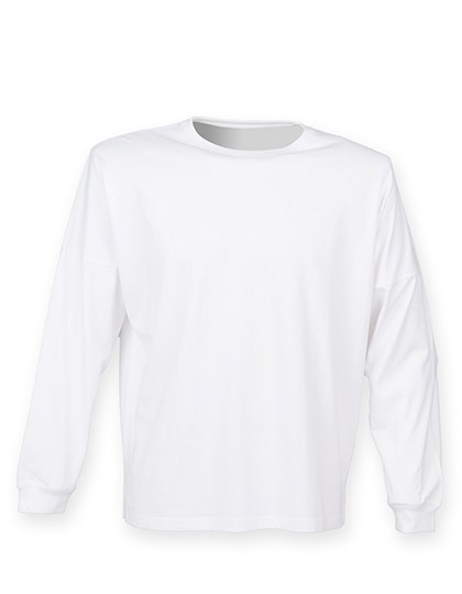 Übergroß mit heruntergesetztem Armloch für eine optimale Gestaltungsfläche | Halsausschnitt und Bündchen im Rippenmuster mit Ziernaht | Nackenband und Seitenschlitze | Gerade Vorderseite, gesenkter Rückensaum | Entfernbares SF (Skinnifit) Label