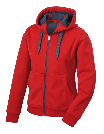 Sportive Bonding-Damenjacke mit Kapuze | Kapuze mit Kinnschutz | Full-Zip | Kordel und Innenseite in Kontrastfarbe | Kängurutaschen | Flatlocknähte | Elastische Bündchen an Arm- und Bundabschluss | Angesetzte Ärmel | Taillierte Form