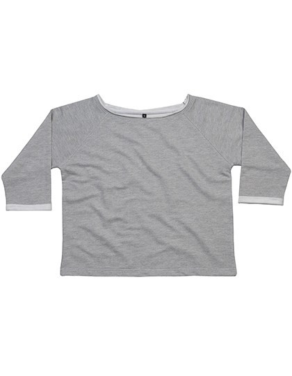 French Terry aus Bio-Baumwolle und rPET (= recyceltes PET (z.B. recycelte Plastikflaschen, etc.)) | Lockere Passform | Ungesäumter Halsausschnitt | Weiter, schulterfreier Ausschnitt | Gerollte Ärmel in ¾-Länge | Gerader Saum | Raglan-Ärmel | Abreißetikett