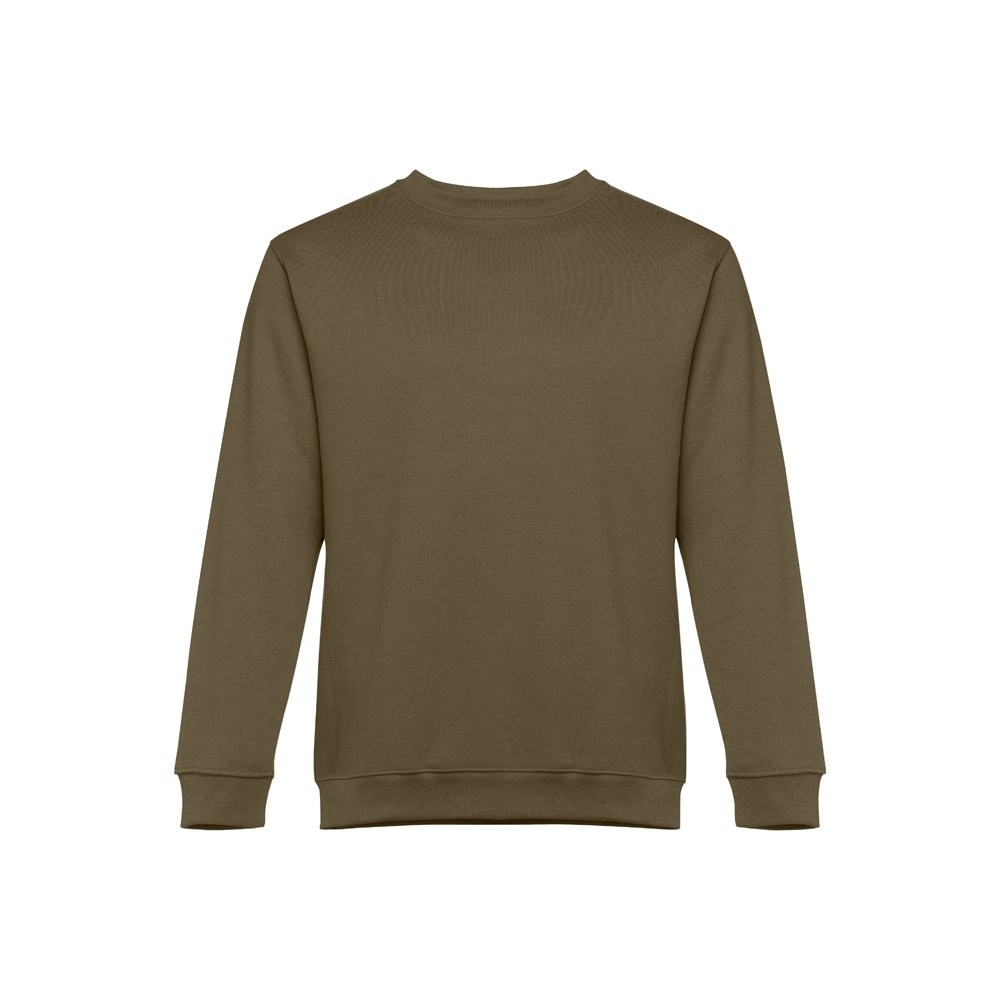 Sweatshirt aus 50% Baumwolle und 50% Polyester (300g/m²), unisex. Innen kardiert, 1x1 Ripp, Bund am Ärmel und Saum, Doppelnaht und Verstärkungsband am Kragen. Größen: S, M, L, XL, XXL