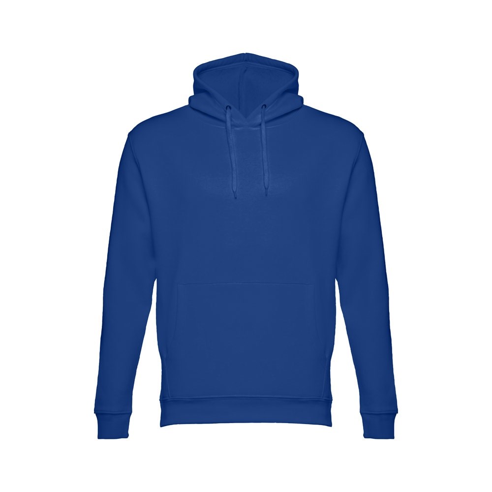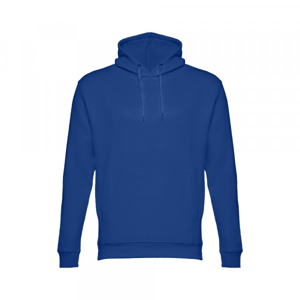 Sweatshirt aus 50% Baumwolle und 50% Polyester (320g/m²), unisex mit einer Kapuze mit Kordelzug. Innen kardiert, 1x1 Ripp, Bund an Ärmel und einer Kängurutasche. Größen: XS, S, M, L, XL, XXL
