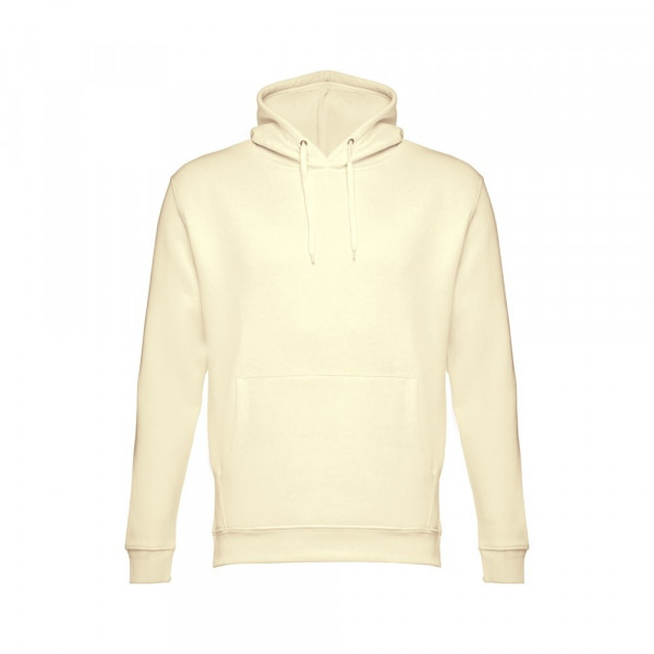 Sweatshirt aus 50% Baumwolle und 50% Polyester (320g/m²), unisex mit einer Kapuze mit Kordelzug. Innen kardiert, 1x1 Ripp, Bund an Ärmel und einer Kängurutasche. Größen: XS, S, M, L, XL, XXL