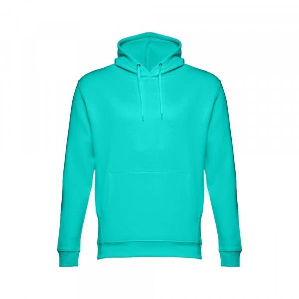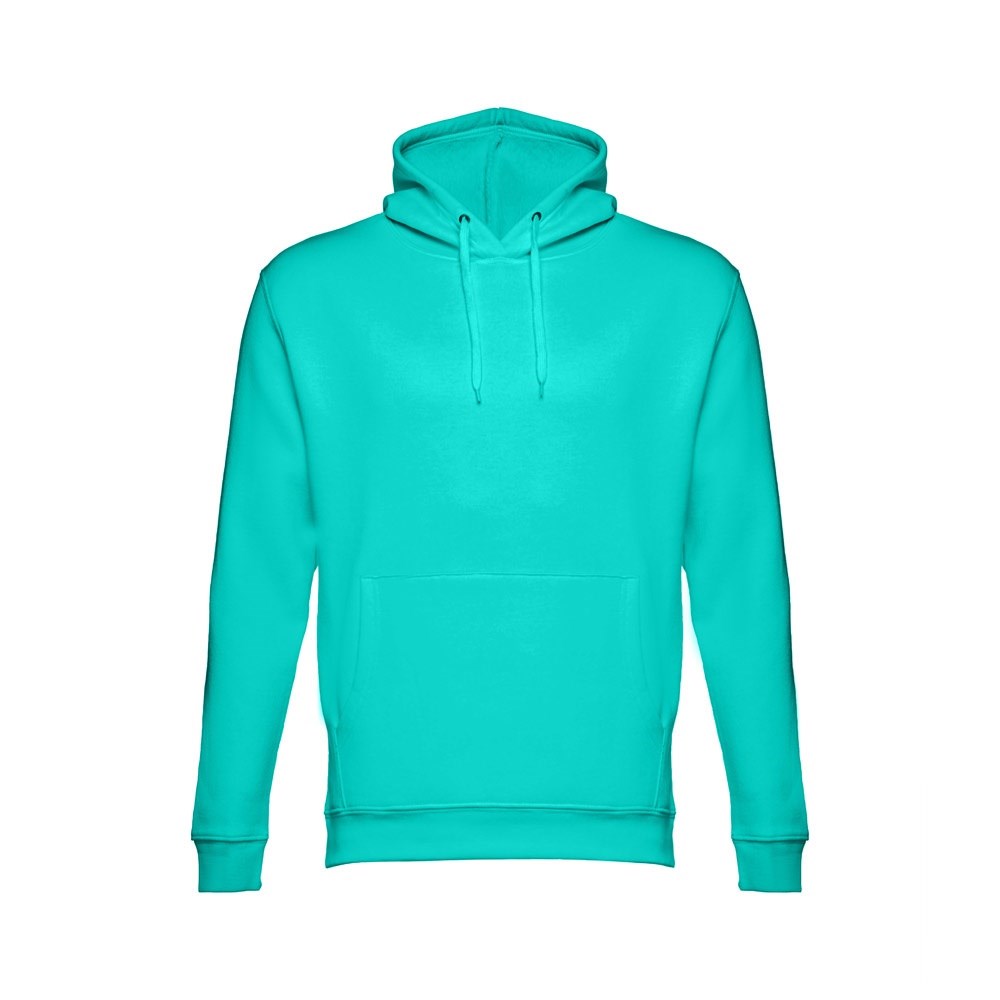 Sweatshirt aus 50% Baumwolle und 50% Polyester (320g/m²), unisex mit einer Kapuze mit Kordelzug. Innen kardiert, 1x1 Ripp, Bund an Ärmel und einer Kängurutasche. Größen: XS, S, M, L, XL, XXL