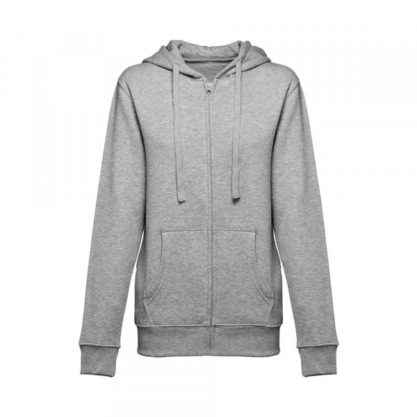Damen Sweatjacke aus 50% Baumwolle und 50% Polyester (320g/m²) mit Reißverschluss und gefütterter Kapuze mit Kordelzug. Kardiert mit 2 Kängurutaschen, einem verdeckten Kunststoffreißverschluss und einem gerripten Bund. Größen: S, M, L, XL, XXL
