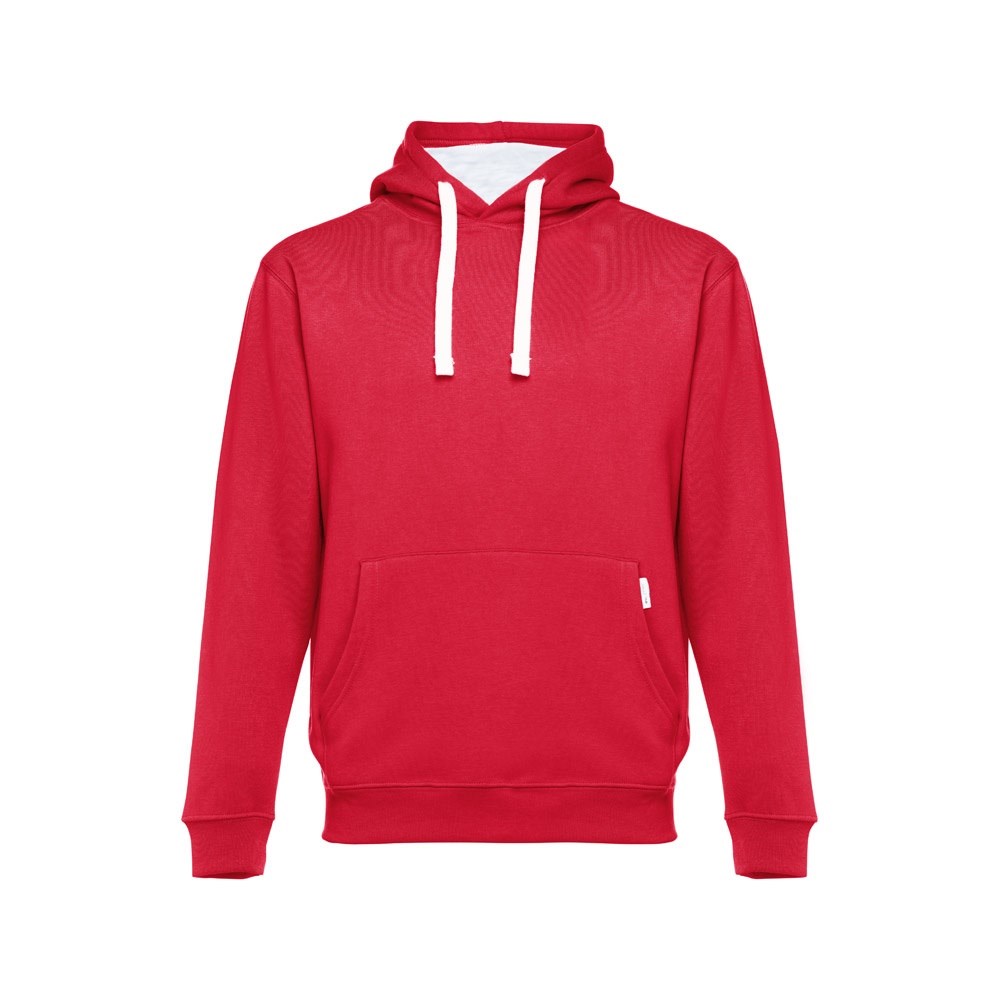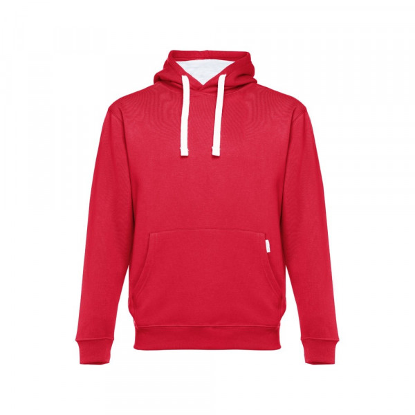 Sweatshirt aus 50% Baumwolle und 50% Polyester (320g/m²), unisex. Von innen kardiert mit einer Kängurutasche und Ripp 1x1 an Ärmelbündchen und Bund. Kapuze mit farblichem Kordelzug. Größen: S, M, L, XL, XXL