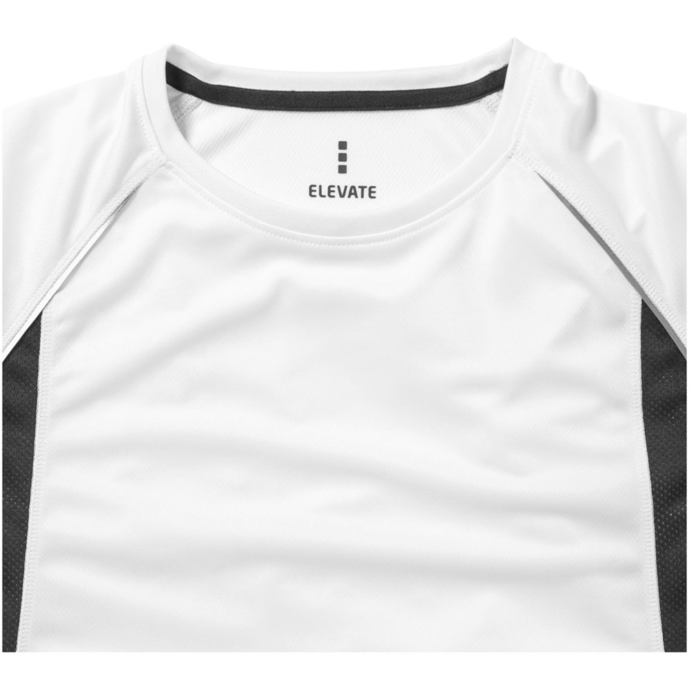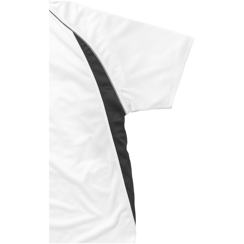 Stoff Einfassung am Kragen. Rundhalsausschnitt. Seiteneinsätze aus Netzmaterial. Reflektierende Details. Raglan Ärmel. Transfer Hauptlabel für den etikettfreien Komfort. Dünne Flatlock-Naht Details. Satin Nackenband.