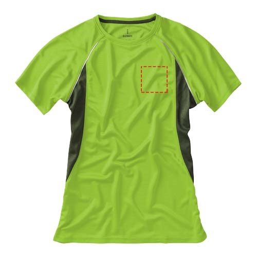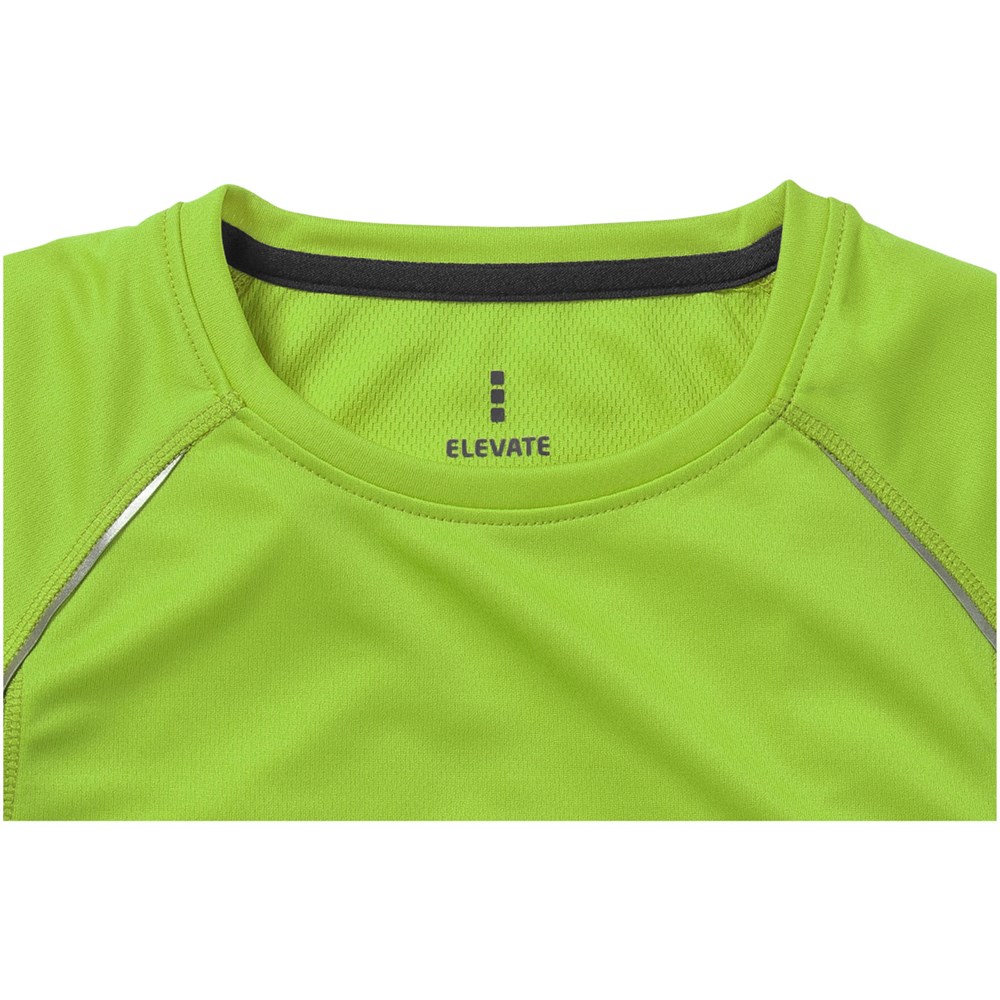Stoff Einfassung am Kragen. Rundhalsausschnitt. Seiteneinsätze aus Netzmaterial. Reflektierende Details. Raglan Ärmel. Transfer Hauptlabel für den etikettfreien Komfort. Dünne Flatlock-Naht Details. Satin Nackenband.