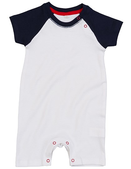 Raglan-Ärmel | Kurze Beinlänge | Kontrastfarbene Ärmel und Halseinfassung | Zwei rote Druckknöpfe an der Raglan-Naht | Rote Druckknöpfe an der Beinöffnung | Weiche und dehnbare Biobaumwolle | Abreißetikett | Interlock