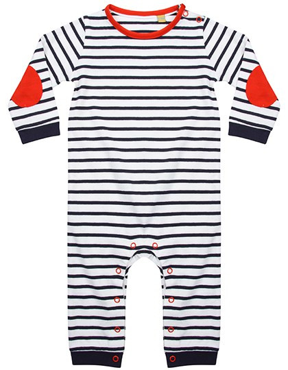 Kontrastfarbene Ripp-Bündchen | Langärmliger, gestreifter Strampler | Single-Jersey | Kontrastfarbener Kragen und Ellenbogeneinsätze | Kontrastfarbener YKK-Druckknopf-Verschluss am Hals und den Beinen