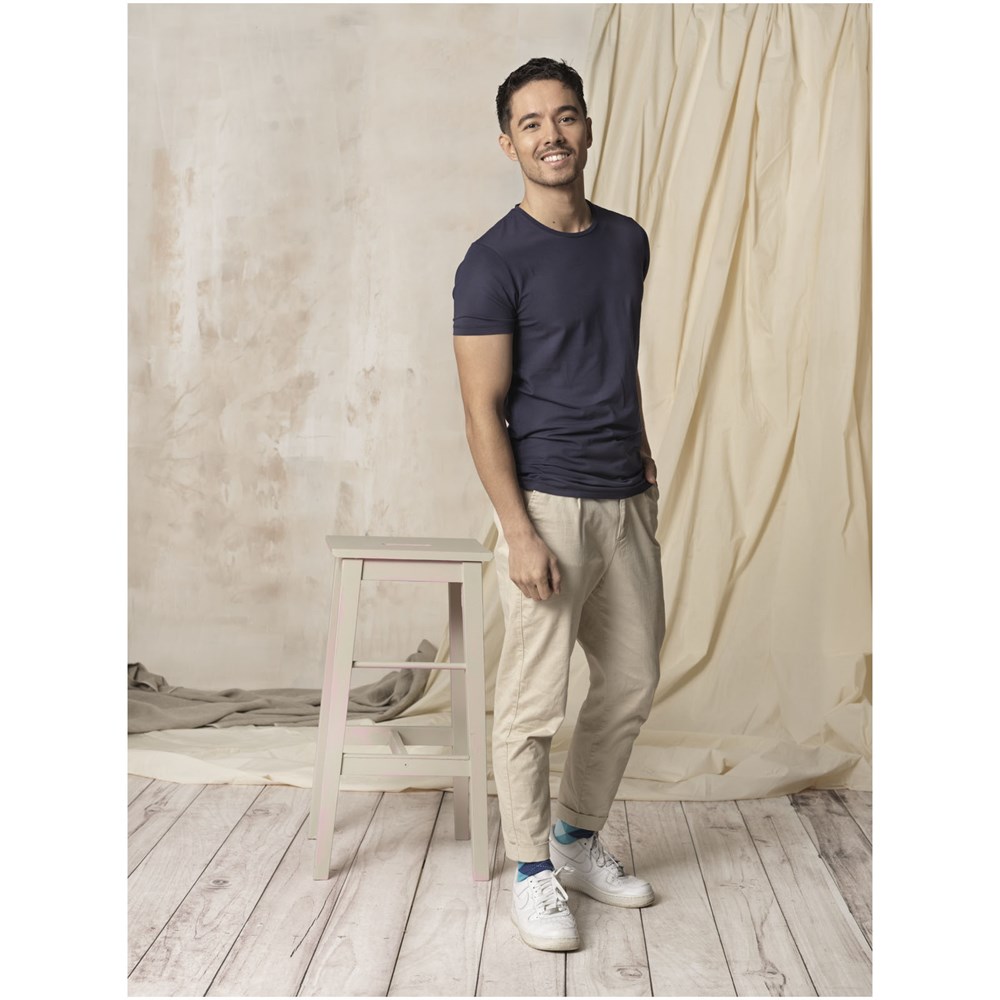 Nachhaltige Promotionbekleidung. Stoff Einfassung am Kragen. Rundhalsausschnitt. Stetch-Material. Doppelnaht an Kragen und Saum. Zweifarbiges Schulter zu Schulter Nackenband. Transfer Hauptlabel für den etikettfreien Komfort.