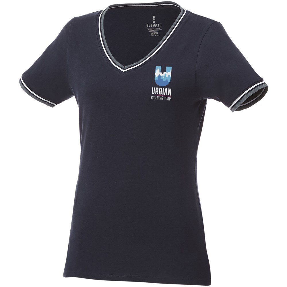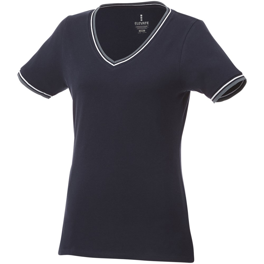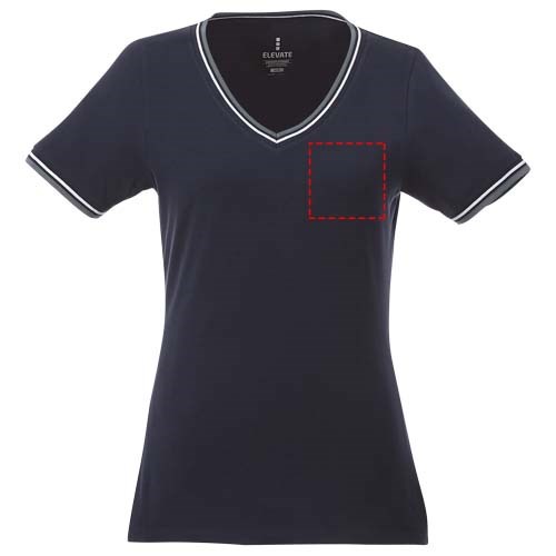 Flachstrickkragen. 1x1 Rippstrickkragen und Bund. Kontrastfarbige Streifen an Kragen und Ärmeln. V-Ausschnitt. Doppelnaht an Kragen und Saum. Transfer Hauptlabel für den etikettfreien Komfort.