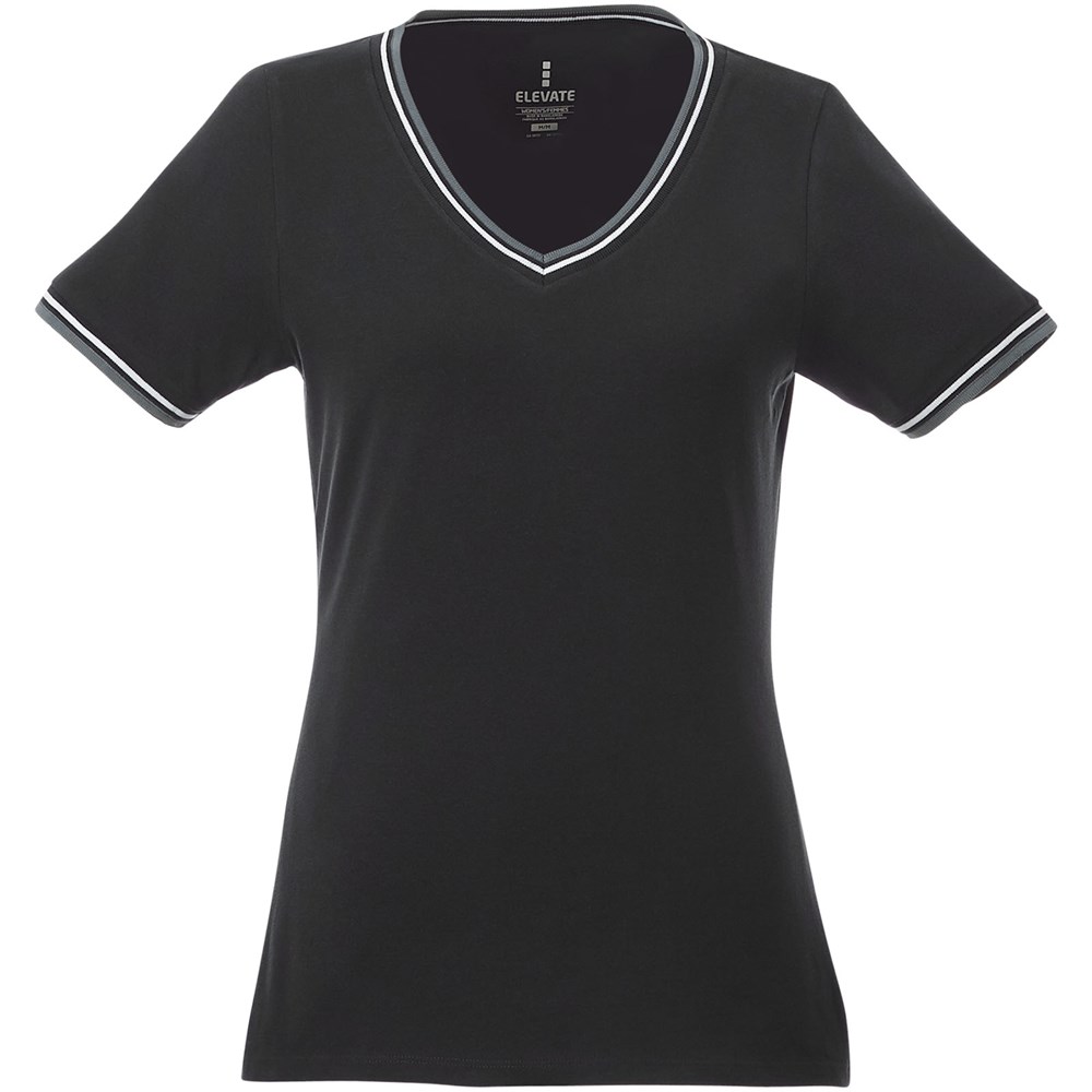 Flachstrickkragen. 1x1 Rippstrickkragen und Bund. Kontrastfarbige Streifen an Kragen und Ärmeln. V-Ausschnitt. Doppelnaht an Kragen und Saum. Transfer Hauptlabel für den etikettfreien Komfort.