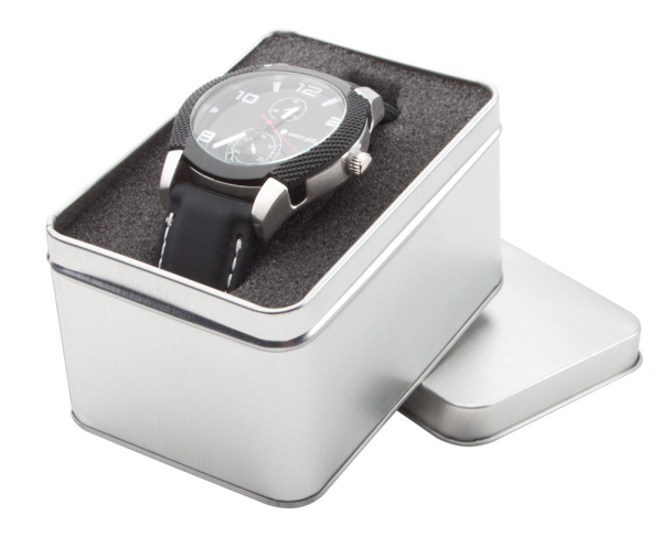 Elegante Armband-Uhr mit Silikon-Armband, verpackt in einer Metallbox. André Philippe Markenprodukt.