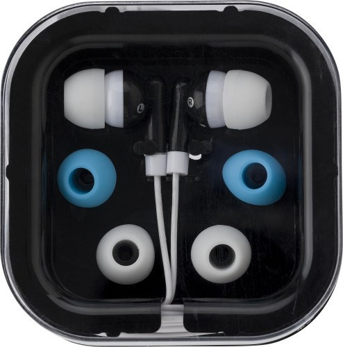 Kopfhörer aus Kunststoff/Metall, Kabellänge ca. 100 cm, mit zwei Paar Ersatz-Kopfhörerschützern (2 Farben), verpackt in einer Kunststoffbox mit transparentem Deckel.