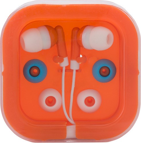 Kopfhörer aus Kunststoff/Metall, Kabellänge ca. 100 cm, mit zwei Paar Ersatz-Kopfhörerschützern (2 Farben), verpackt in einer Kunststoffbox mit transparentem Deckel.