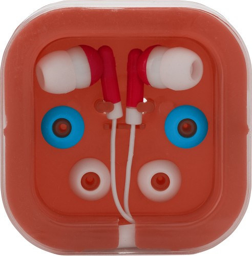 Kopfhörer aus Kunststoff/Metall, Kabellänge ca. 100 cm, mit zwei Paar Ersatz-Kopfhörerschützern (2 Farben), verpackt in einer Kunststoffbox mit transparentem Deckel.